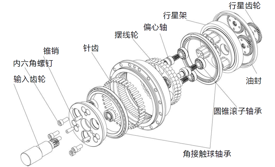 臺灣鑫松RV減速機,在大陸有1500平米的倉庫備貨,一般常用的20E、40E、80E這些型號減速比57、81、101、105、121、153等比數都有現貨,品質上臺灣鑫松RV減速機重復定位精度在40弧秒內,話不多少,下圖為RV減速機構造主要零部件!